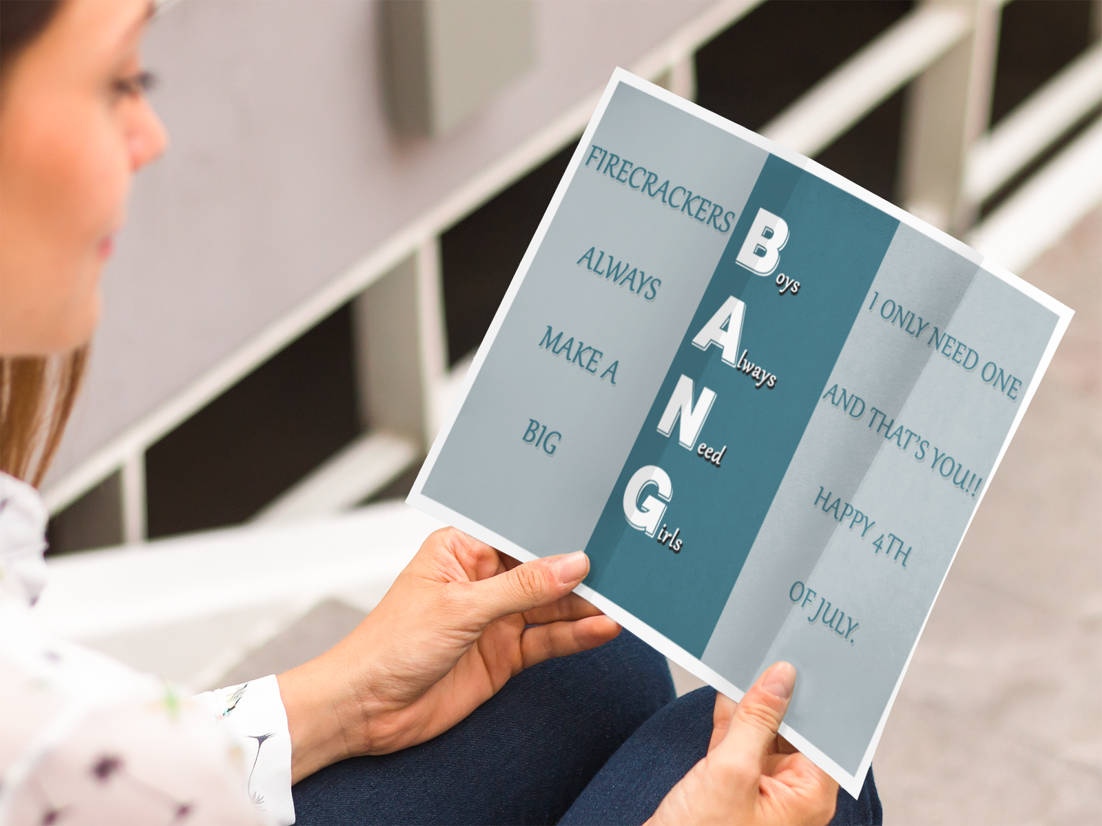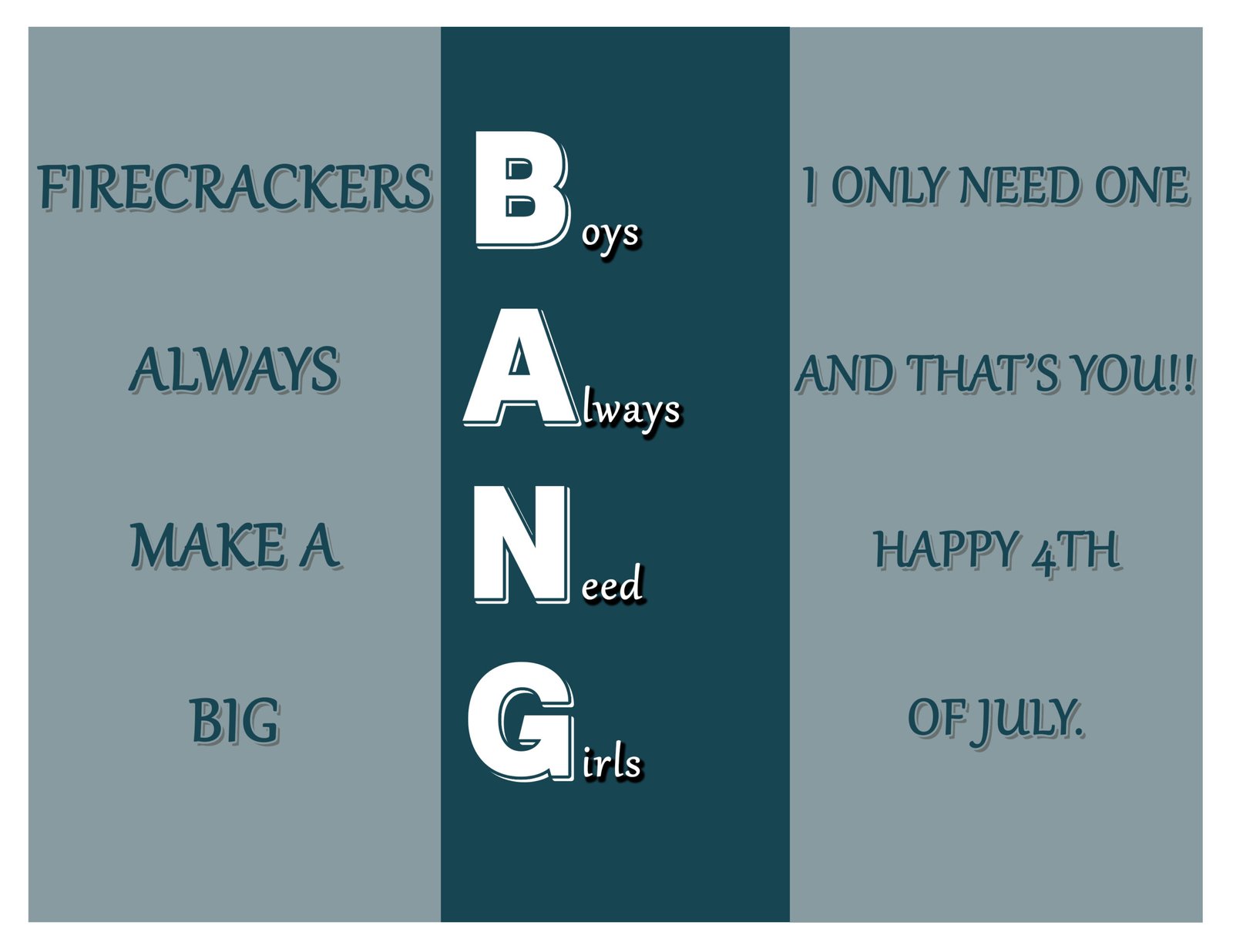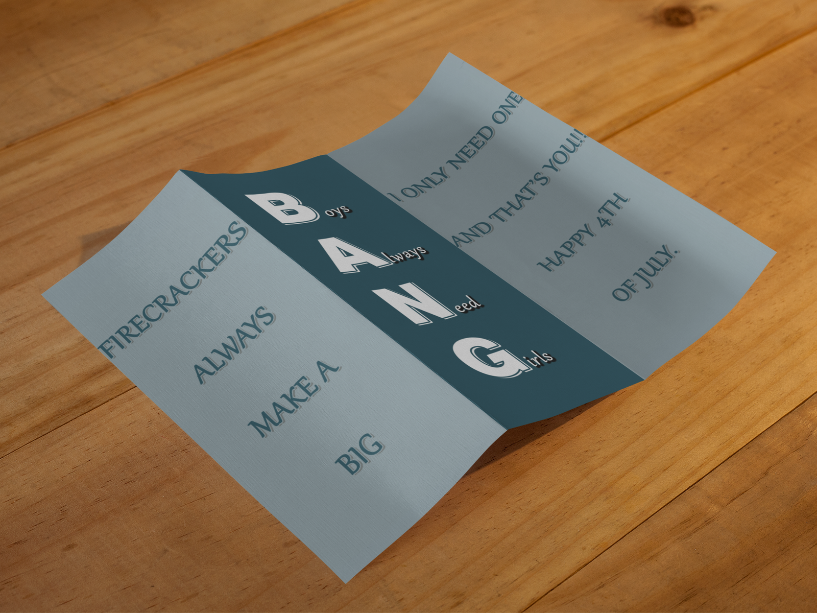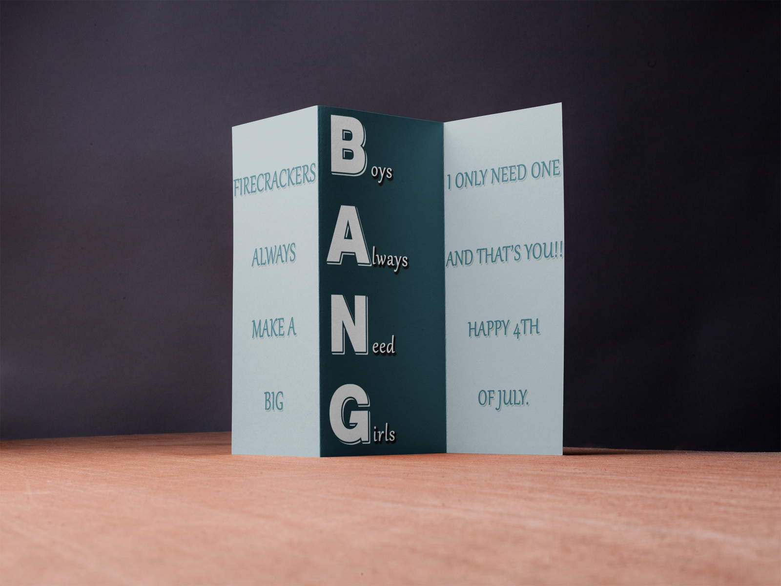 BANG – Boys Always Need Girls is a fun, bold, and playful trifold design inspired by the excitement of fireworks and the joy of celebrating the 4th of July.