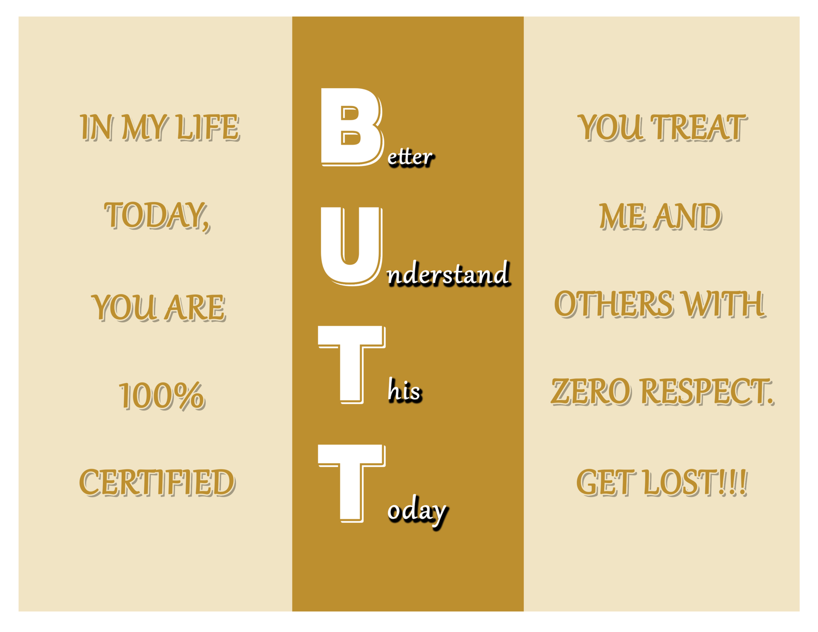 BUTT – Bold Attitude Humor is a golden-toned trifold greeting card designed with a striking acrostic format and a sharp unfolding message. The mustard center panel contrasted with beige sides creates a bold and confident look.