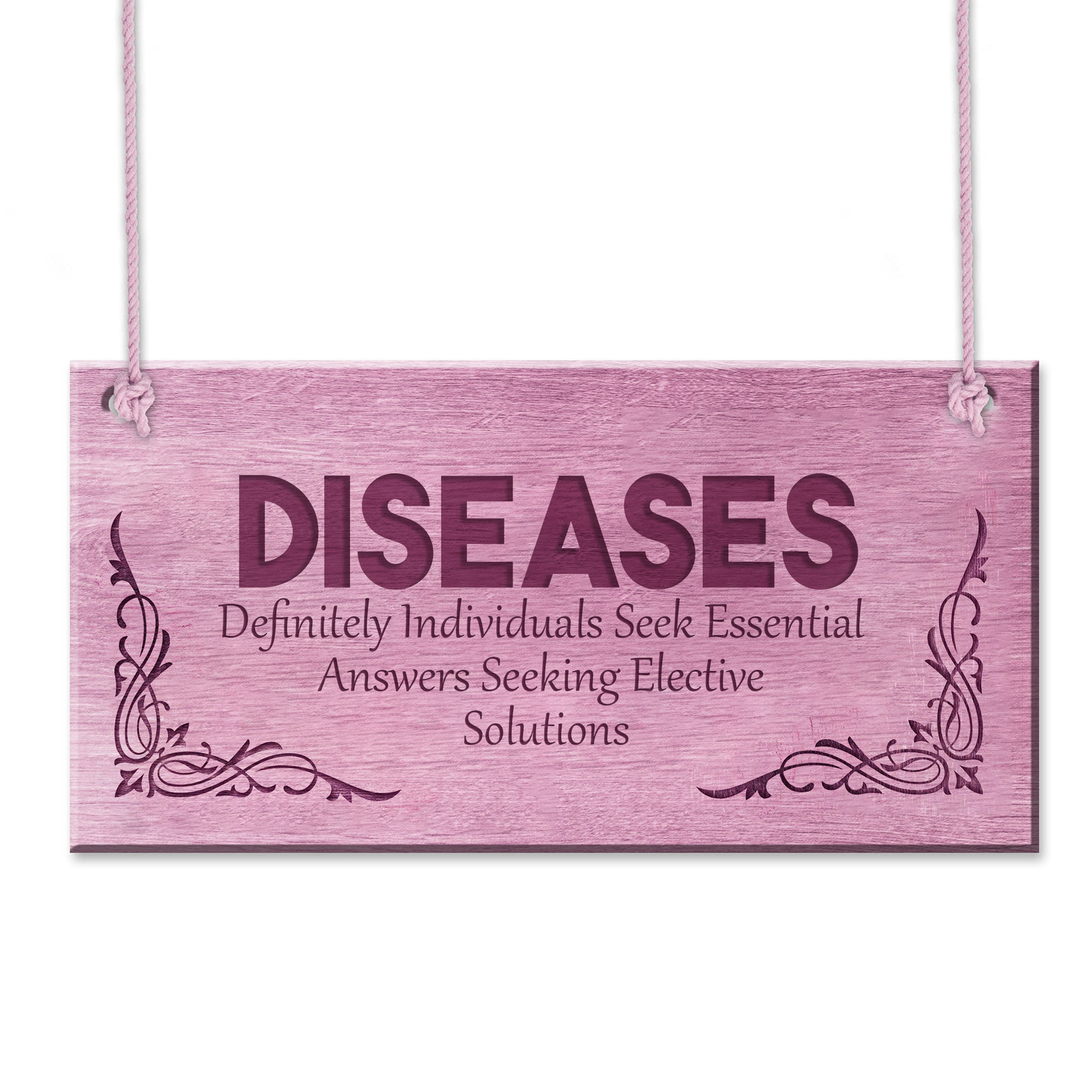 DISEASES – Definitely Individuals Seek Essential Answers Seeking Elective Solutions is a plaque that brings awareness to the ongoing search for answers in the field of health and disease. It’s ideal for medical professionals, clinics, or as a conversation starter about the challenges and solutions in healthcare.