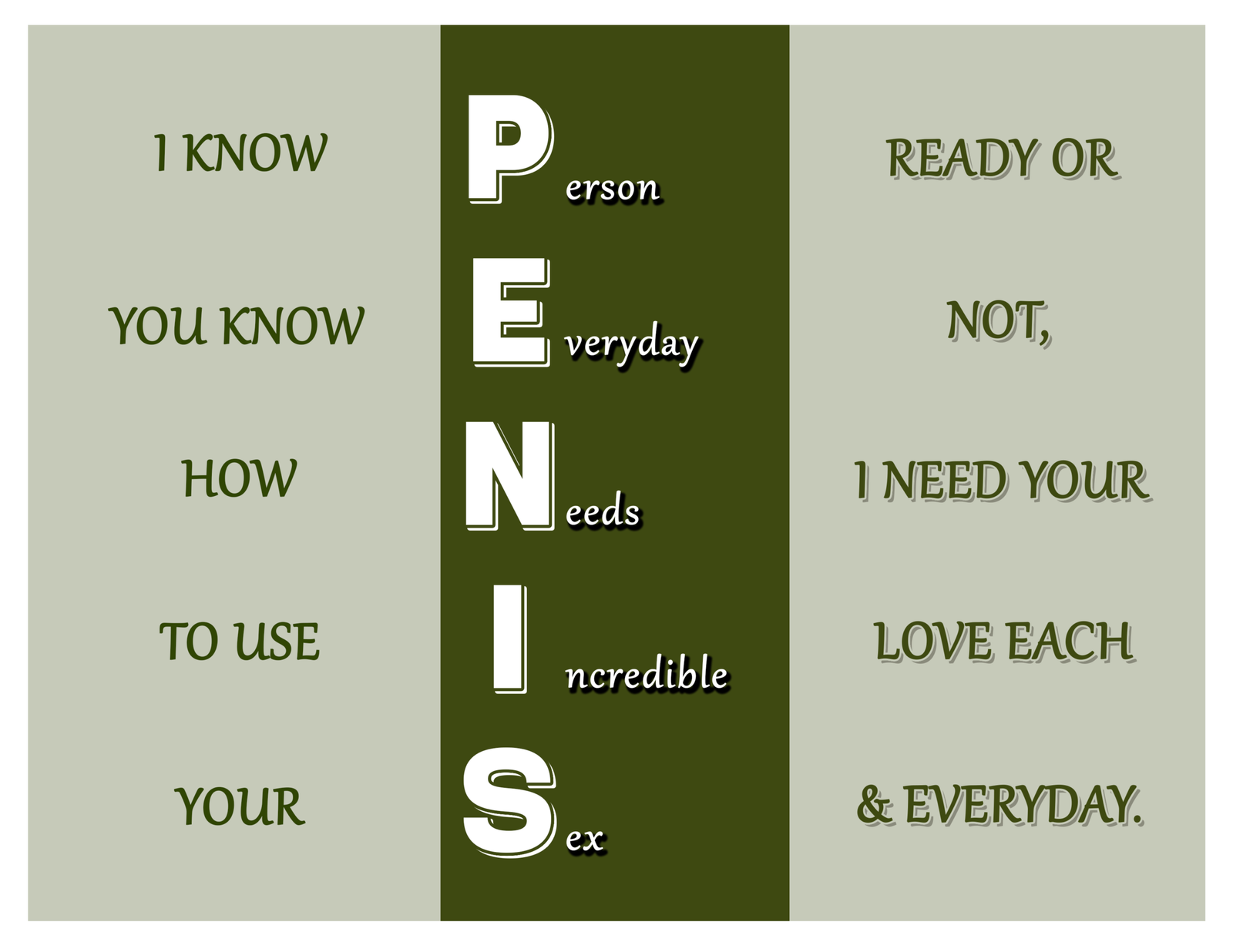 PENIS – Romantic Twist Humor is an olive green-themed trifold greeting card featuring a clever acrostic structure with a soft yet surprising unfolding message. The muted green palette paired with bold typography creates a balanced romantic tone.